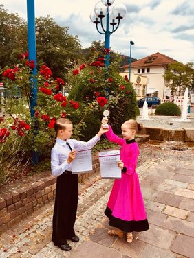 Das junge Kinderpaar startete in der Leistungsklasse der Anfänger, D. Sowohl in den Standardtänzen - Langsamer Walzer, Tango und Quickstep sowie den Lateintänzen - Cha-Cha-Cha, Rumba und Jive konnten David & Ksenia überzeugen. Bei beiden Turnieren holten sich die jungen Böblinger Silber.